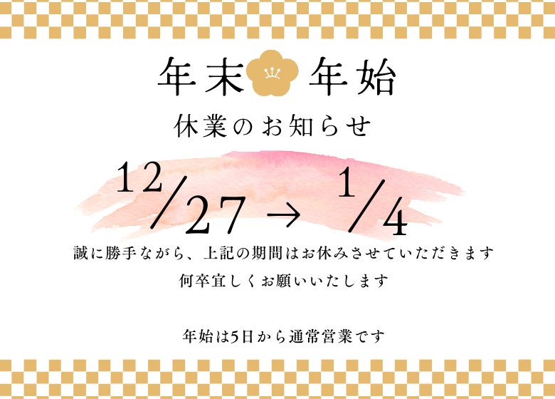 弊社では、年末年始休業を下記の通りとさせていただきます。